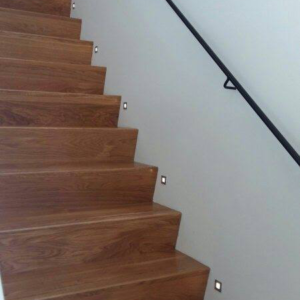 De treden zijn in de muur bevestigd en “hangen” aan de handregel. De rvs-ballusters zorgen voor de stabiliteit en het dragende vermogen.