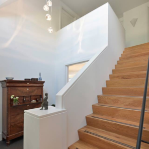 Door het gebruik van RVS- slipstrippen en RVS-leuningen en leuninghouders is dit een moderne trap.